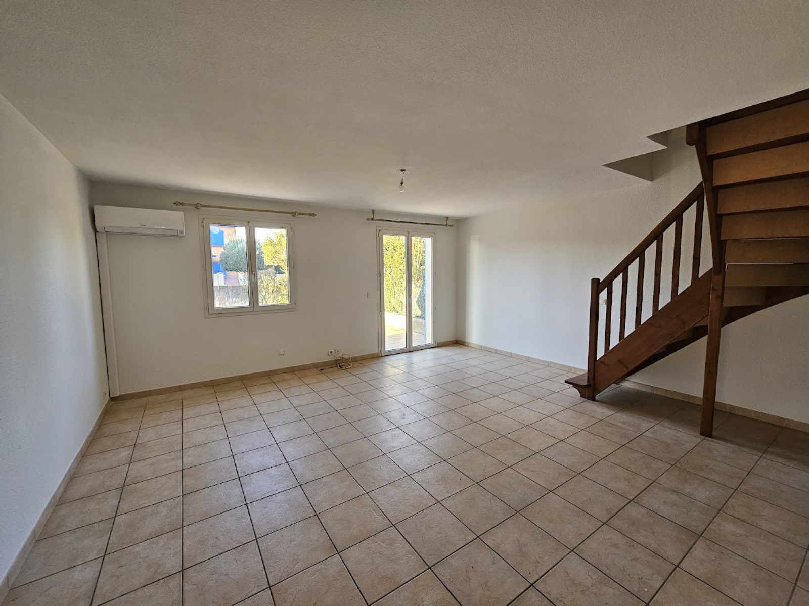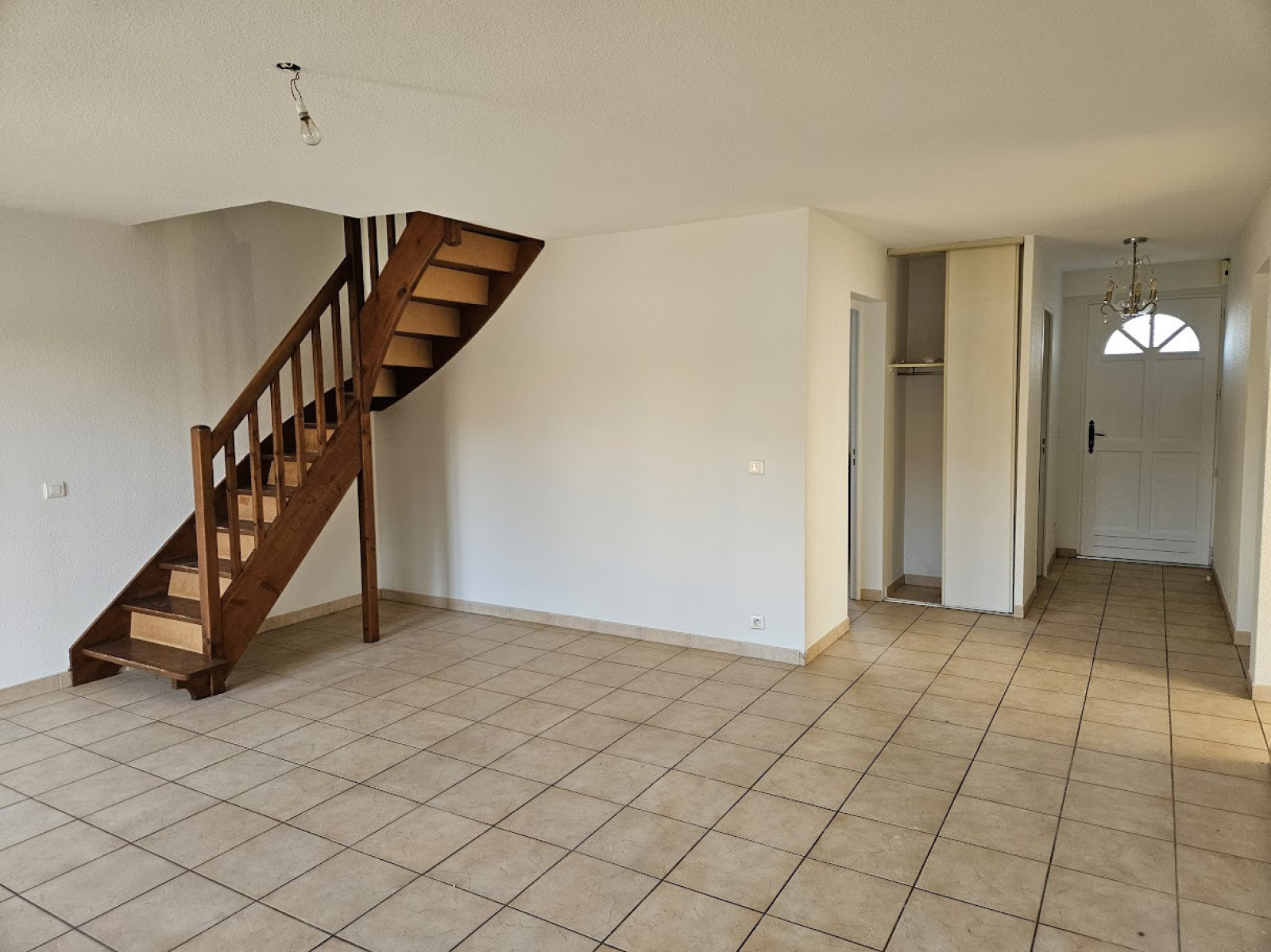 MAISON T4 de 99 m² + garage attenant, R+1, mitoyenne d'un coté, au centre du village. Terrain : 401 m². Rez de chaussée : Entrée avec 1 placard, 1 WC, séjour, cuisine aménagée séparée, 1 chambre ( sans placard), 1 salle de bains. Etage : 2 chambres ( sans placard), 1 salle d'eau avec 1 WC. Double vitrage, volets bois. chauffage Pompe à chaleur : réversible/ climatisation en RdC, convecteurs électriques dans les chambres. Dans lotissement au calme. Peinture neuve , split clim reversersible : neuf. Libre. La provision de charges comprend la TOM + entretien clim. Prévoir en sus du loyer : eau, électricité ..